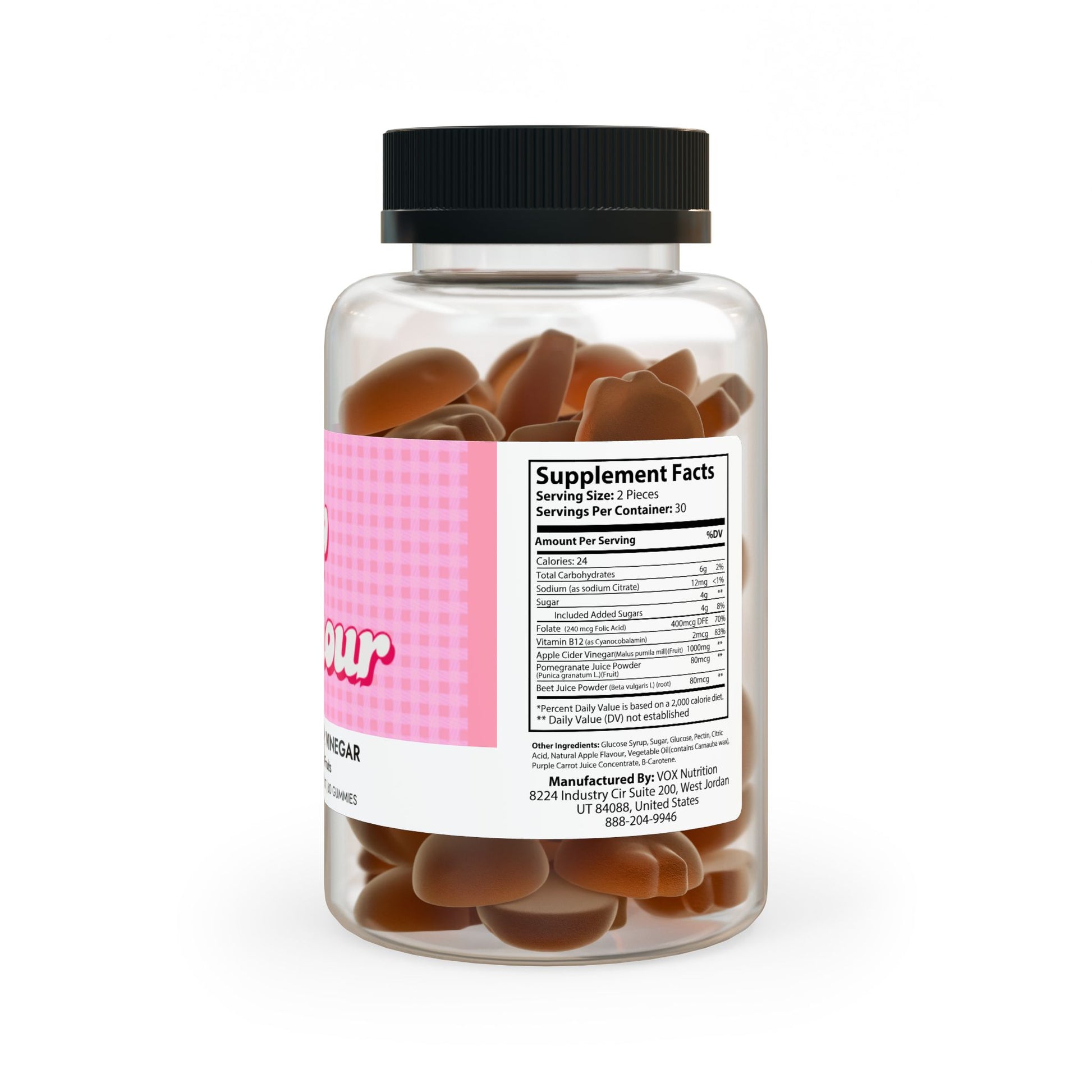 Ingredients: Sodium (as sodium Citrate), Sugar, Folate (240 mcg Folic Acid), Vitamin B12 (as Cyanocobalamin), Apple Cider Vinegar(Malus pumila mill)(Fruit), Pomegranate Juice Powder (Punica granatum L.)(Fruit), Beet Juice Powder (Beta vulgaris L) (root). Other Ingredients: Glucose Syrup, Sugar, Glucose,Pectin, Citric Acid, Natural Apple Flavour, Vegetable Oil(contains Carnauba wax), Purple Carrot Juice Concentrate, B-Carotene.